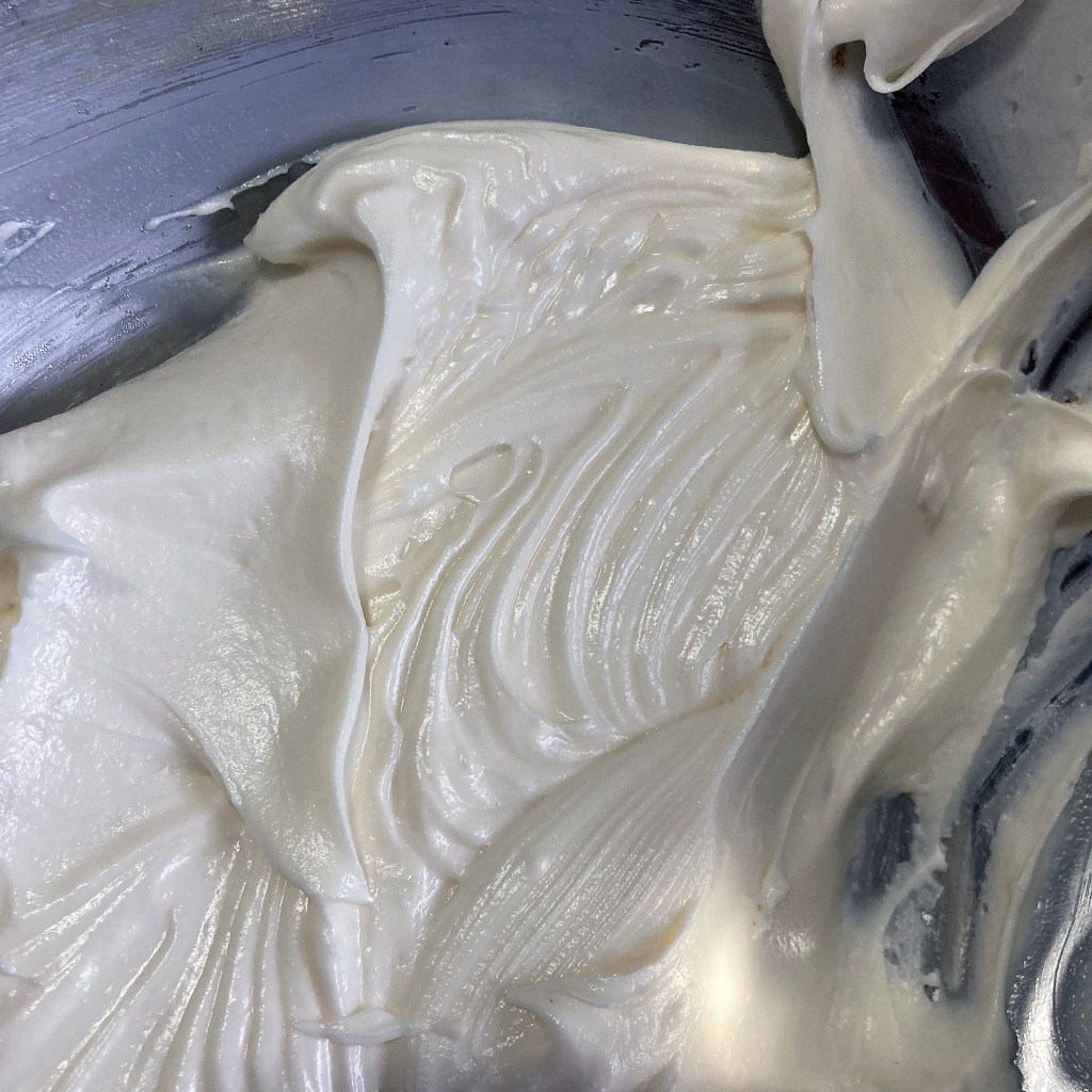 Mix butter, cream cheese, vanilla then add sugar. First between layers, top and sides.
