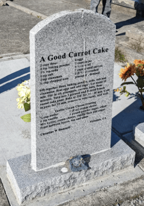 This recipe is a little different than the previous ones I have made. It can be found on a white tablet gravestone for Christine W Hammill in Ferndale, California. Her stone sits beside the stone for her husband Richard. The difference is that Christine and Richard are still living.