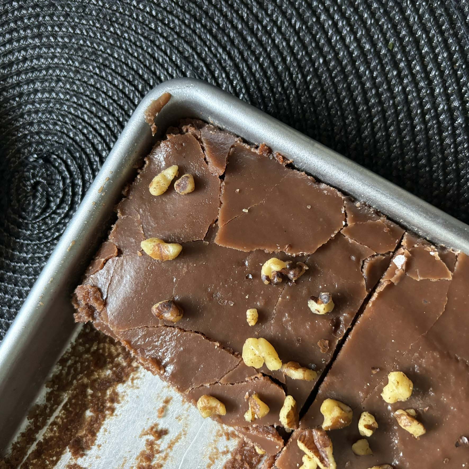 The recipe says to pour the frosting onto the hot cake. The cake didn’t rise, but it didn’t have a lot of room for icing either and I was afraid it would spill over the sides and make a big mess. To avoid that, I used a spatula to carefully spread small amounts at a time. In the end, I was able to cover the whole cake without any issues. I then topped it with a handful of walnuts.