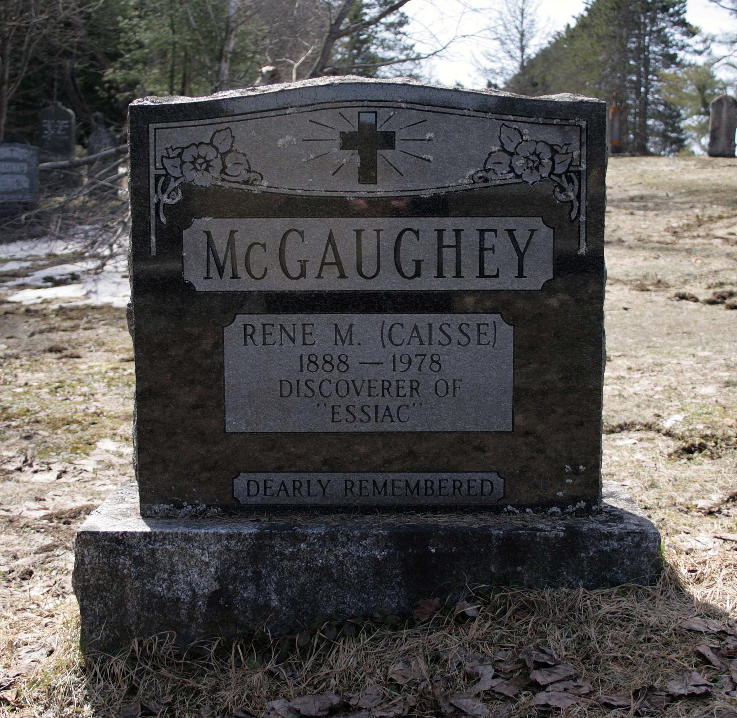 René M. Caisse McGaughey suffered a broken leg after a fall at her home, from which she never recovered.8 Five weeks later, on December 26, 1978, she passed away at the age of 90.8 Although she received tempting offers to establish clinics in the United States, she chose to remain in Canada. In her writings, she explained that her ancestors had come to Canada from France in the 1700s and that she was determined to prove the merit of ESSIAC in Canada so the country would receive the credit.4 Not far from the statue that first caught my eye, Caisse now rests in Saint Joseph’s Roman Catholic Cemetery in Bracebridge.
