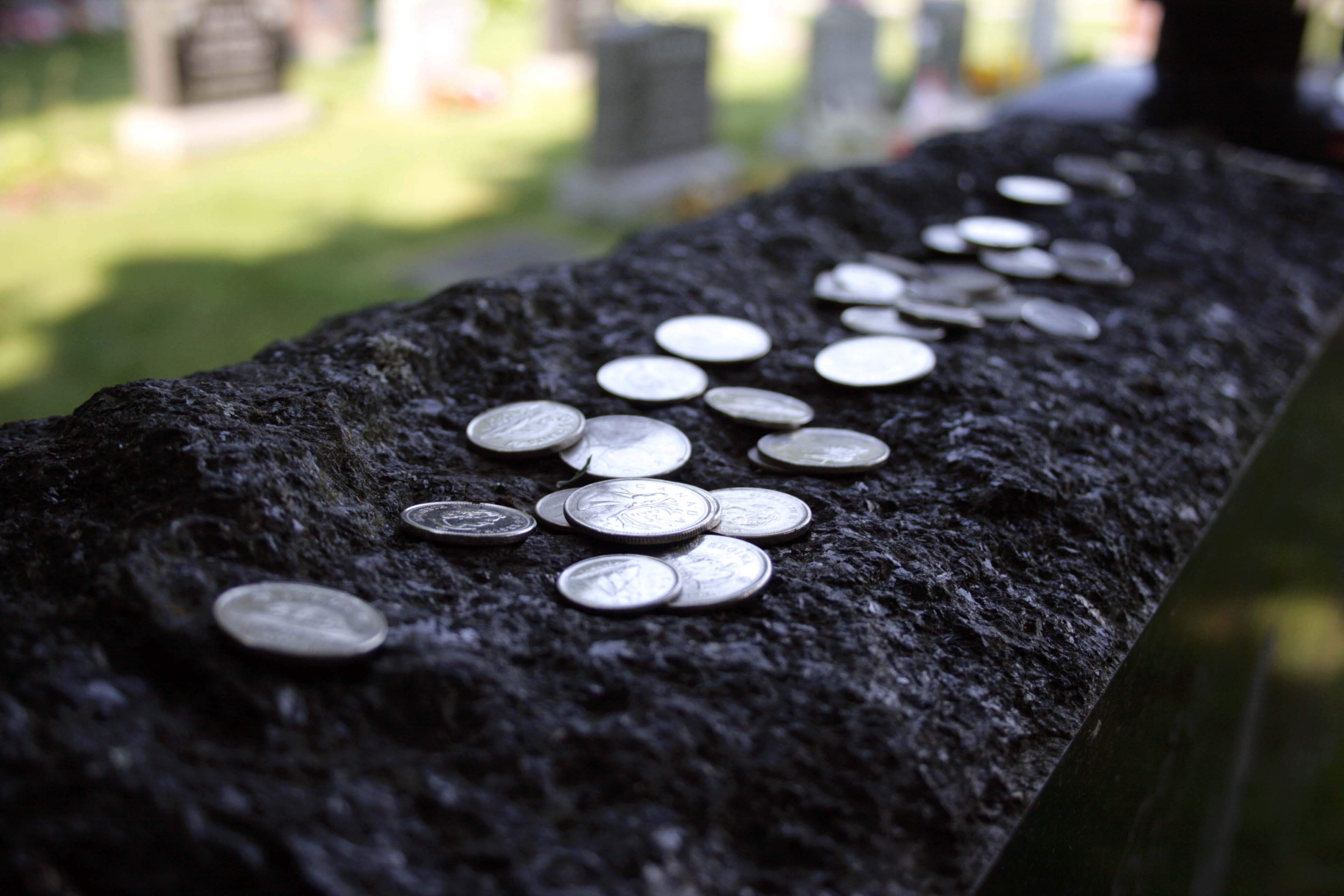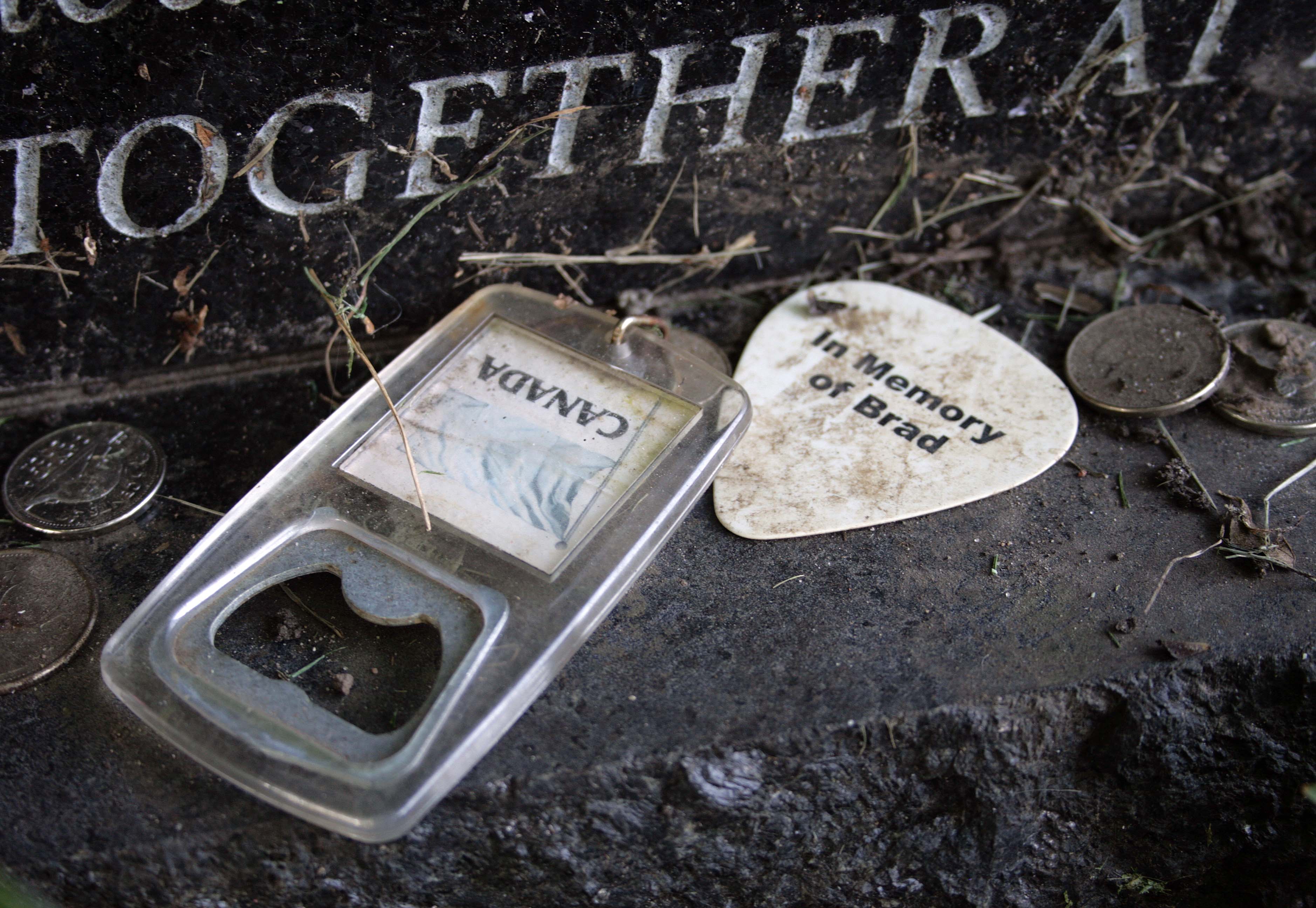His black granite gravestone immediately stands out, both for its design and for everything left around it. The stone features a portrait of Connors in profile with his guitar, set in front of an outlined map of Canada, a simple but meaningful tribute. There is also a Bible verse inscribed on the stone, adding another personal layer to the memorial.