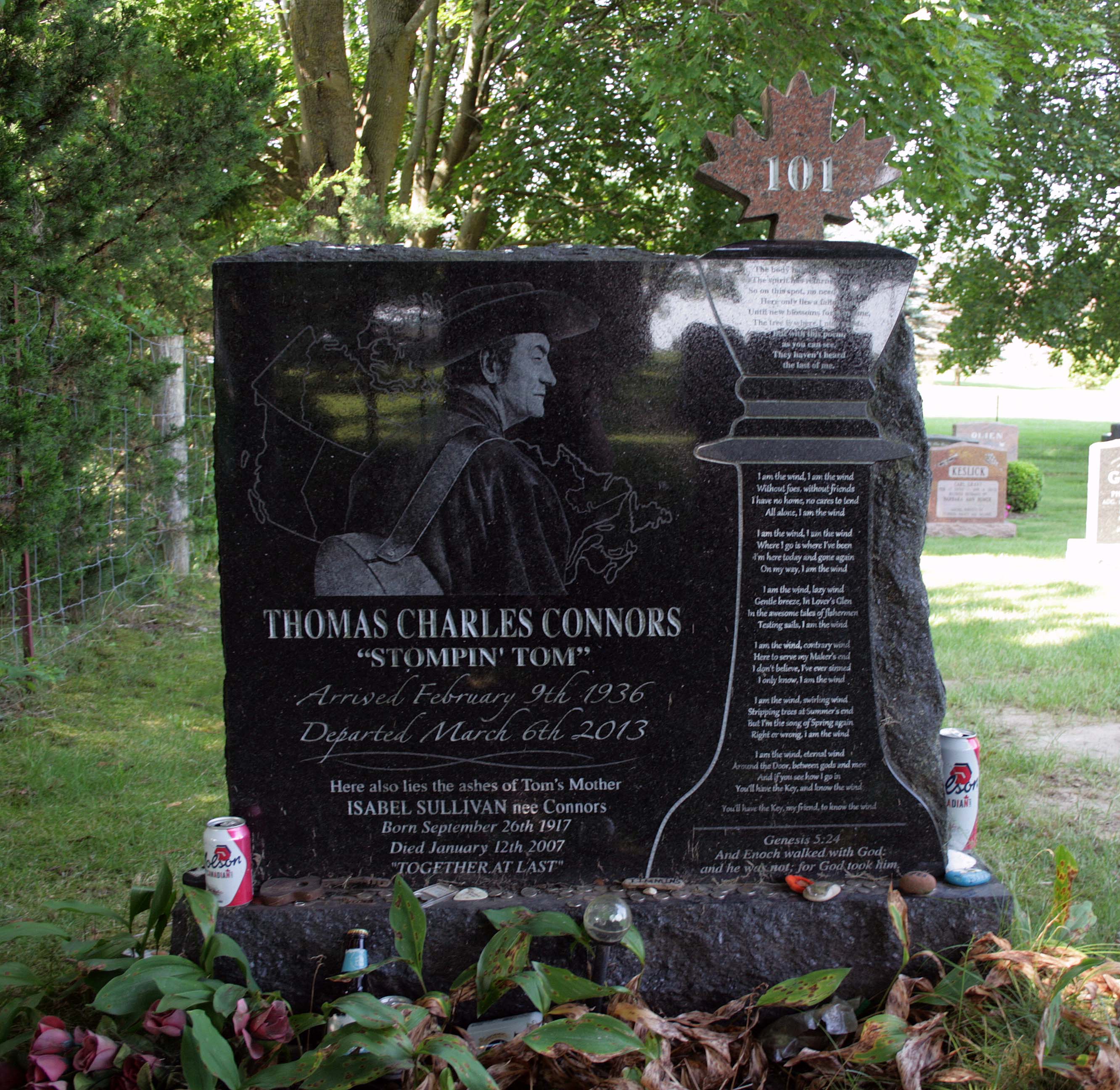 Stompin’ Tom Connors is buried at Erin Cemetery in Erin, Ontario, alongside the ashes of his mother.7 It’s a small rural cemetery in a town southwest of Toronto, surrounded by rolling countryside where life moves at a slower, more peaceful pace.