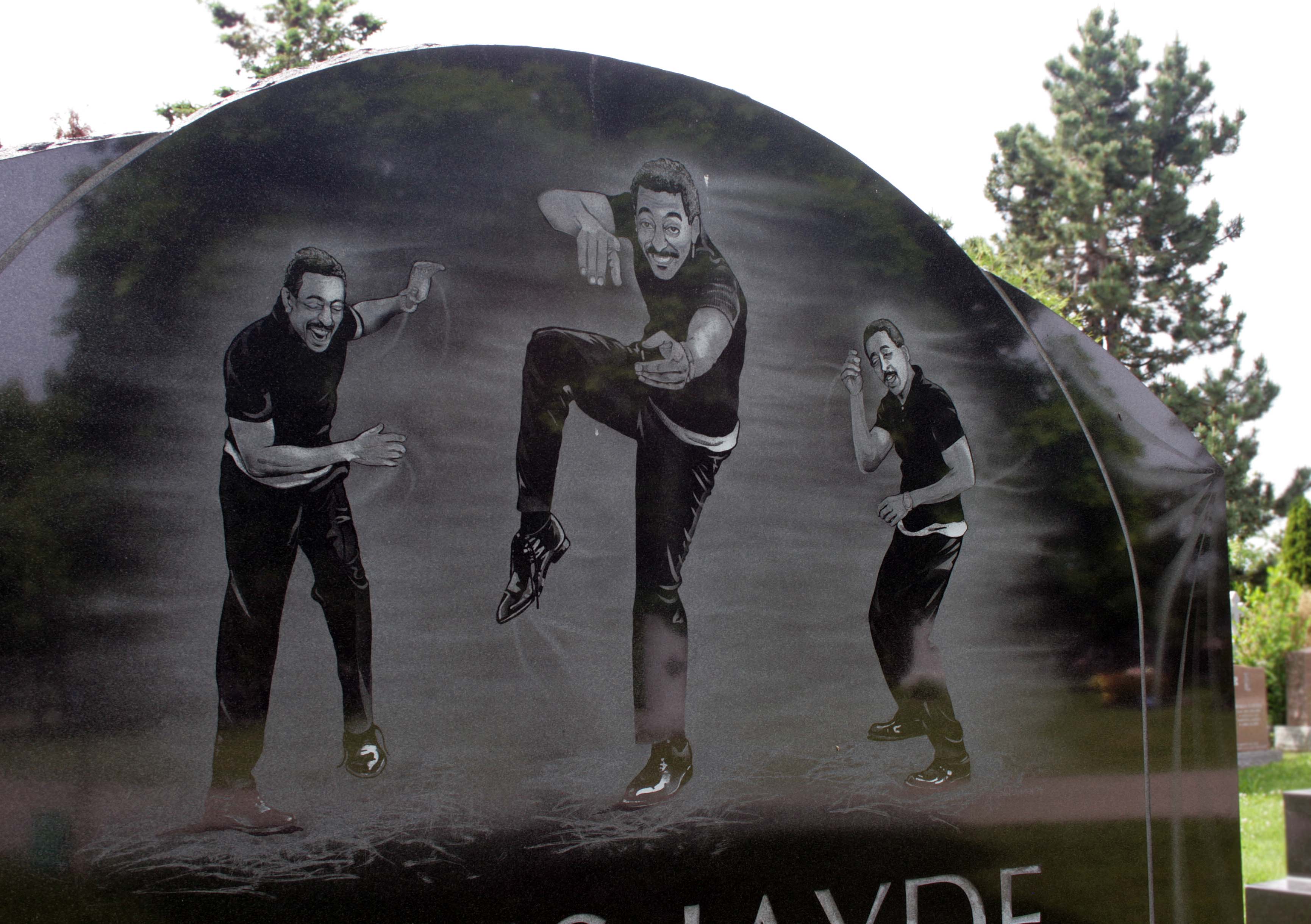 The Hines-Jayde gravestone is a beautiful monument, made from black granite. At the top of the stone is a sandblasted engraving of Hines dancing, framed by what looks like curtains on either side of the stone. He is depicted with a look of joy and happiness on his face. It’s a lovely representation of what he is best known for, and what was such a large part of his life.