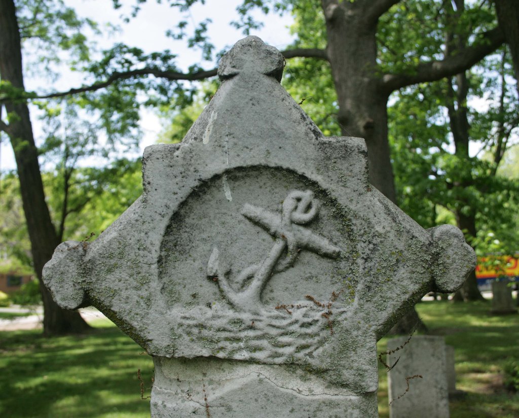 Sometimes anchors are found on the graves of sailors or those who have died at sea, but this is rare. The anchor is a Christian symbol and represents hope, steadfastness, and calm.