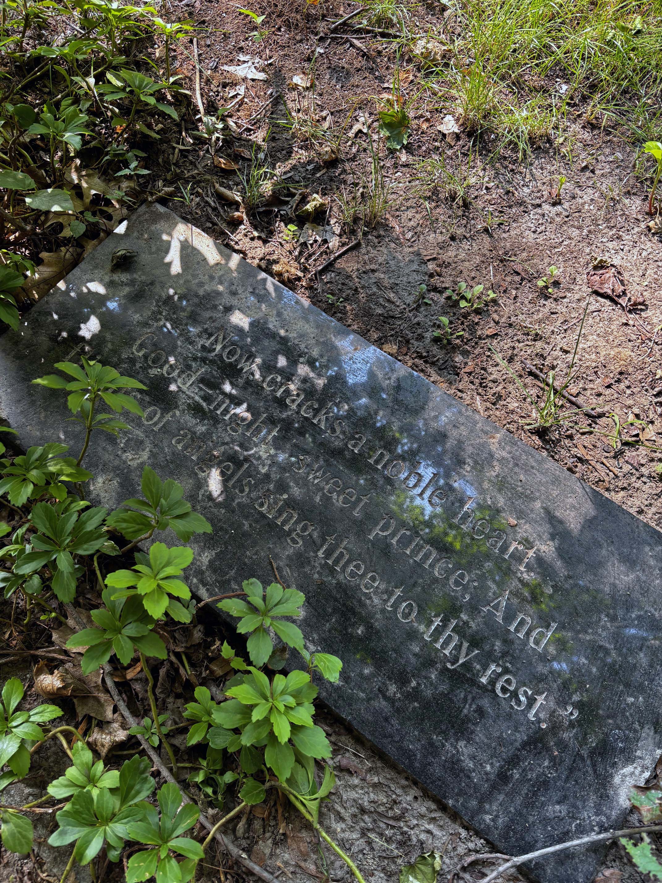 On the footstone is inscribed a quote from Shakespeare’s Hamlet, “Now cracks a noble heart. / Good-night sweet prince; And / flights of angels sing thee to thy rest.”