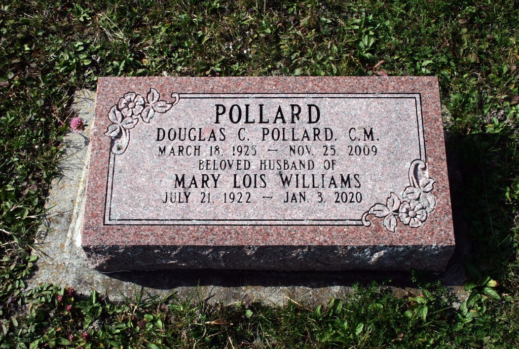 Douglas is laid to rest beside his second wife, Lois Pollard who passed away on January 3, 2020, at the age of 98. Their gravestone reads: “Pollard / Douglas C. Pollard. C.M. / March 18, 1925 — Nov. 25, 2009 / Beloved Husband of / Mary Lois Williams / July 21, 1922 — Jan. 3, 2020”